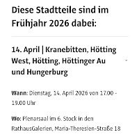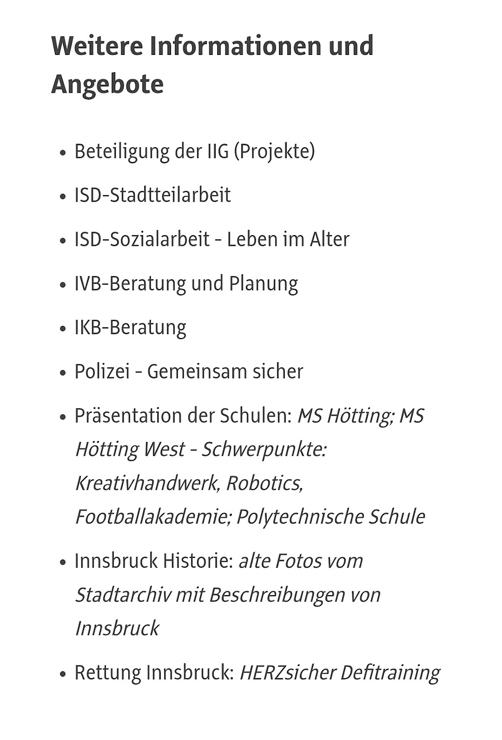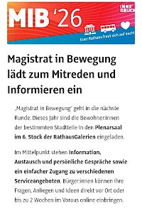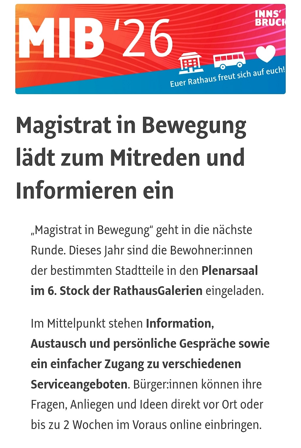 Die Veranstaltung kommt nicht mehr in die einzelnen Stadtteile, sondern findet in Zusammenlegung mehrerer Stadtteile im Plenarsaal im Rathaus statt. https://mitgestalten.innsbruck.gv.at/de-DE/projects/mib26