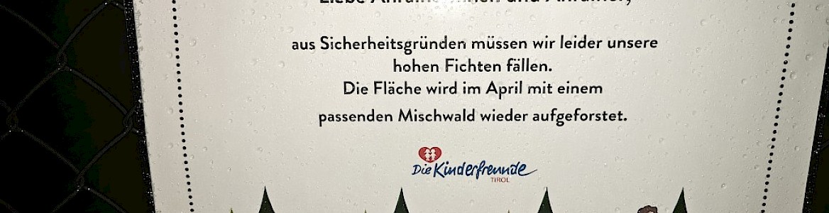 Dadurch hat sich die Leitung der Kinderfreunde lobenswerterweise entschlossen, der Gefahr für Mensch und Sachwerte vorzubeugen und den Altbestand der Bume zu erneuern. Deshalb werden diese nun gefällt und in der Pflanzsaison wird ein Mischwald mit 60 verschiedenen Bäumen gesetzt.