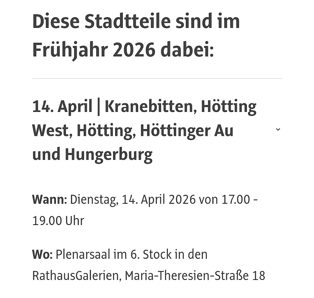 Die Veranstaltung kommt nicht mehr in die einzelnen Stadtteile, sondern findet in Zusammenlegung mehrerer Stadtteile im Plenarsaal im Rathaus statt. https://mitgestalten.innsbruck.gv.at/de-DE/projects/mib26