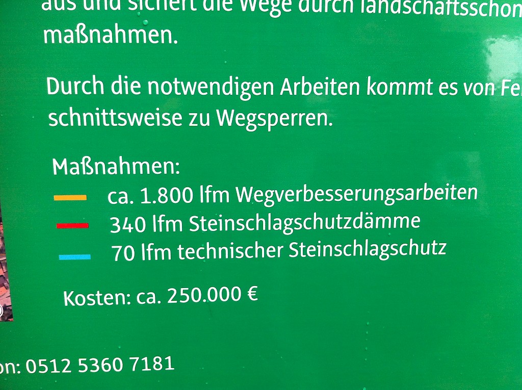 Nunmehr soll eine nicht unbeträchtliche Summe in die Hand genommen werden, um die Sicherheit des beliebten Wanderweges zu gewährleisten. Hiezu wird auch das besonders gefährdete Stück zwischen Hungerburgbahnviadukt und Brücke in einer neuen Ausführung errichtet werden, der alte Weg soll rückgebaut und im Fußbereich der Felswand durch bauliche Maßnahmen gesichert werden.