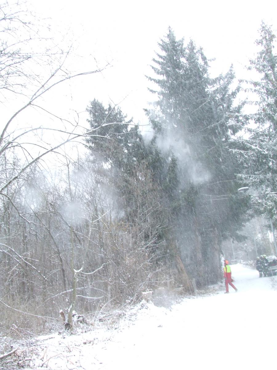 Der zufällig auf der Hungerburg weilende Berufsfeuerwehrmann Manfred Leiter gliederte sich spontan in den Einsatz ein und stellte seine langjährige Erfahrung im Bereich Holzarbeit zur Verfügung. Der gefährliche Baum konnte somit unverzüglich geschnitten werden. Der starke Schneefall gebot überdies Eile.