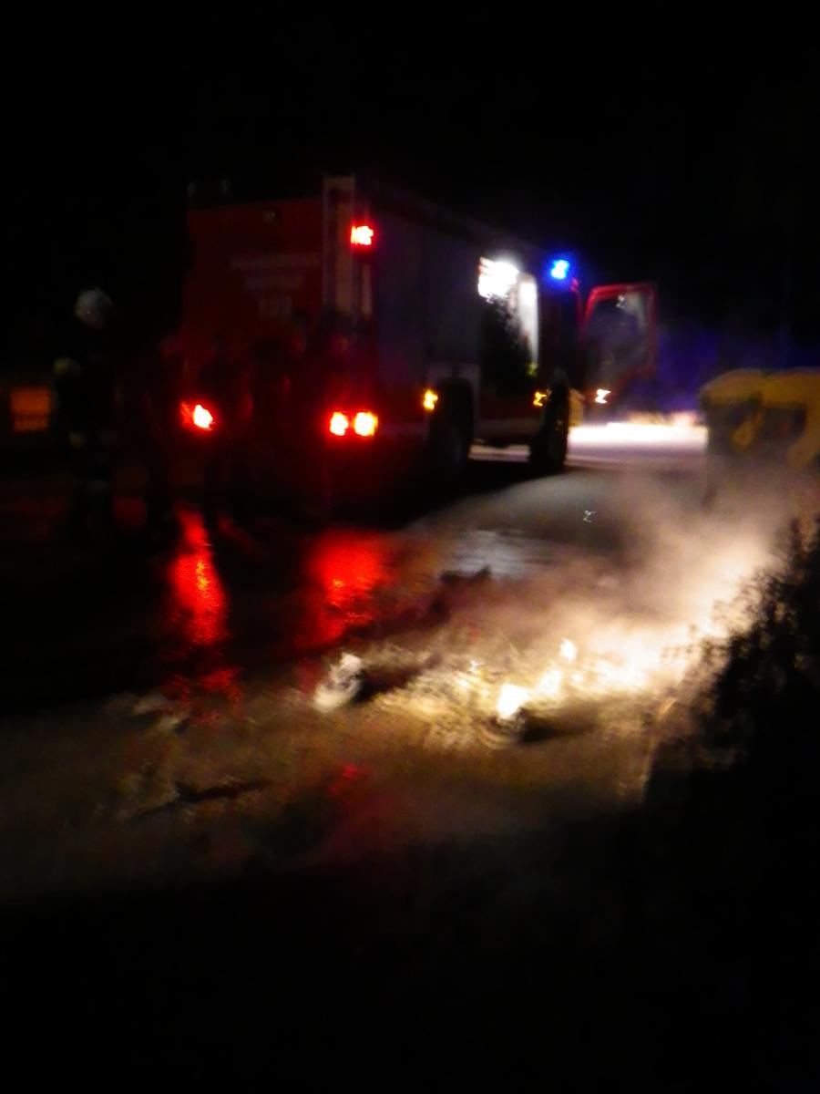 Bei Übergreifen der Flammen auf die anderen Sammelbehälter wären die unmittelbar dahinter geparkten Autos ebenfalls zerstört worden...