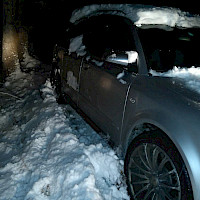 Die extreme Glätte des Waldweges sowie das Fehlen jeglichen Streugutes waren für das Abrutschen eines PKW trotz Allrad verantwortlich, gerade noch aufgefangen wurde der Wagen von einem Baumstumpf am Steilhang. Das hängende Fahrzeug blockierte somit den Weg. Nach erneuter Anfahrt über den tiefverschneiten Umbrückler Alm Weg hatte sich die Lage geändert, mittlerweile hing ein Kleinbus ebenfalls im Steilhang- abgerutscht bis auf wenige cm zum anderen Auto.