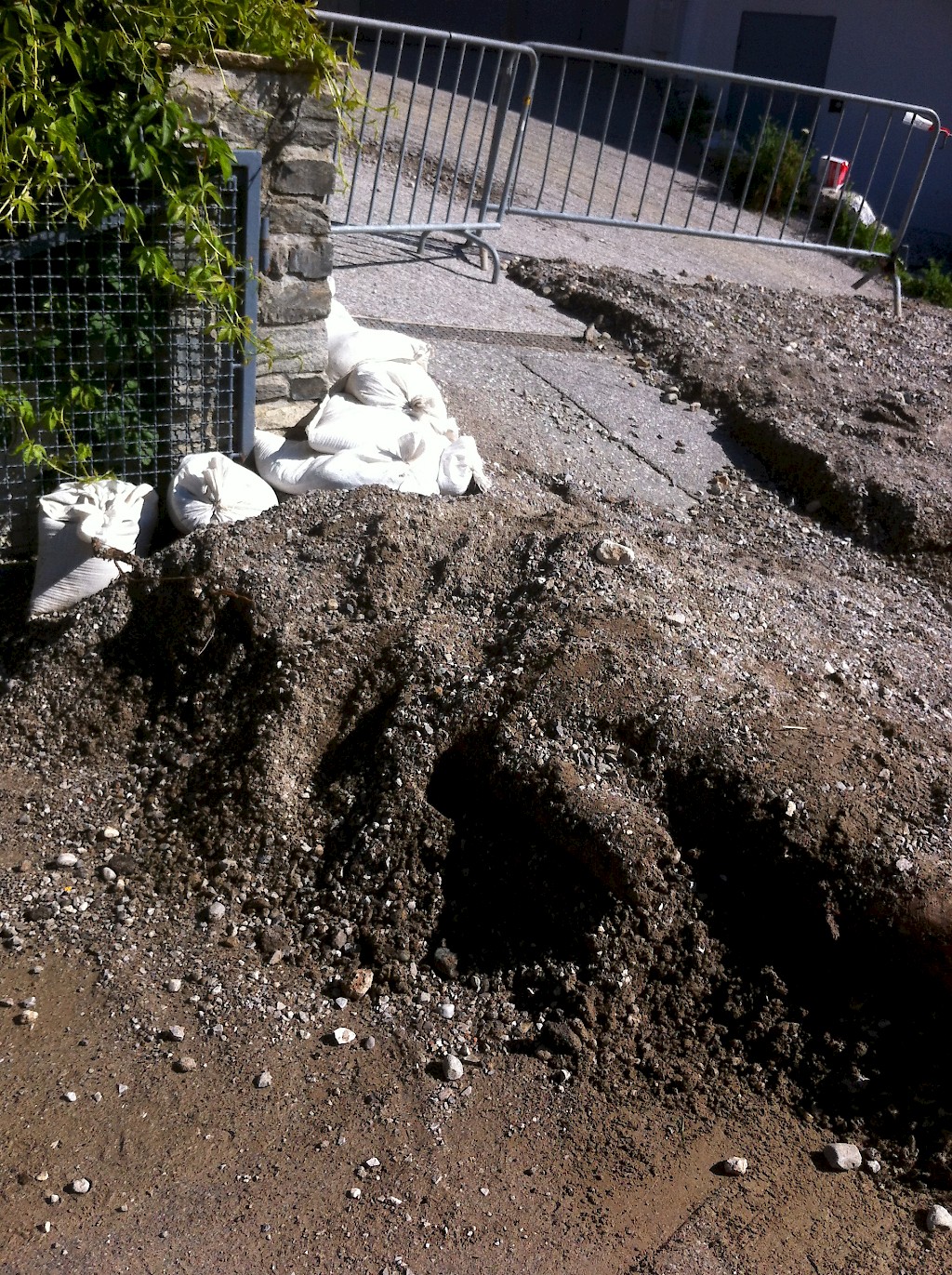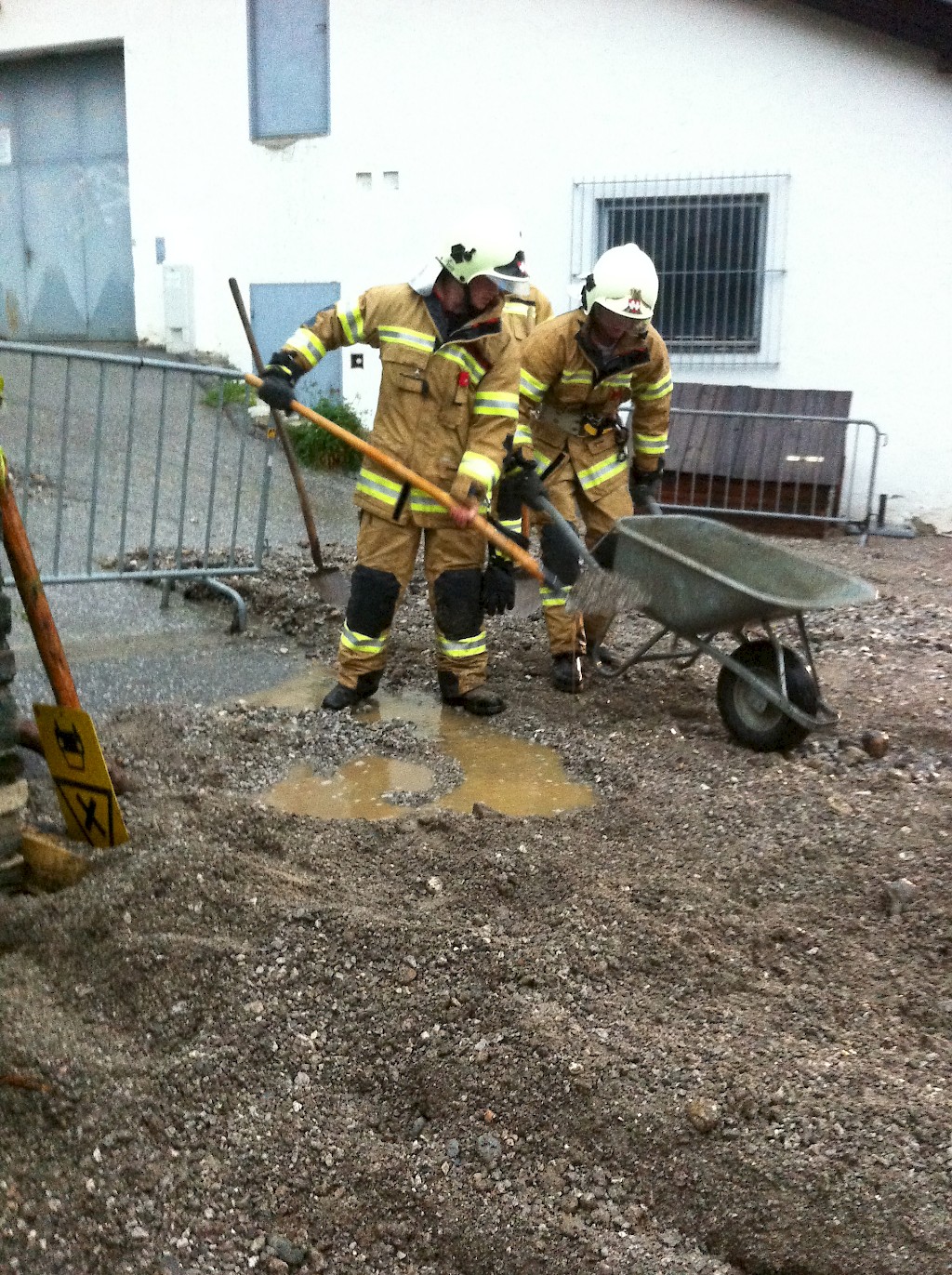 Besonders betroffen war ein Wohnhaus neben dem NKB Parkplatz, welches mittels Pumpen vor dem Wasser und mittels Schaufeln vor dem Geröll vor größerem Schaden bewahrt wurde.